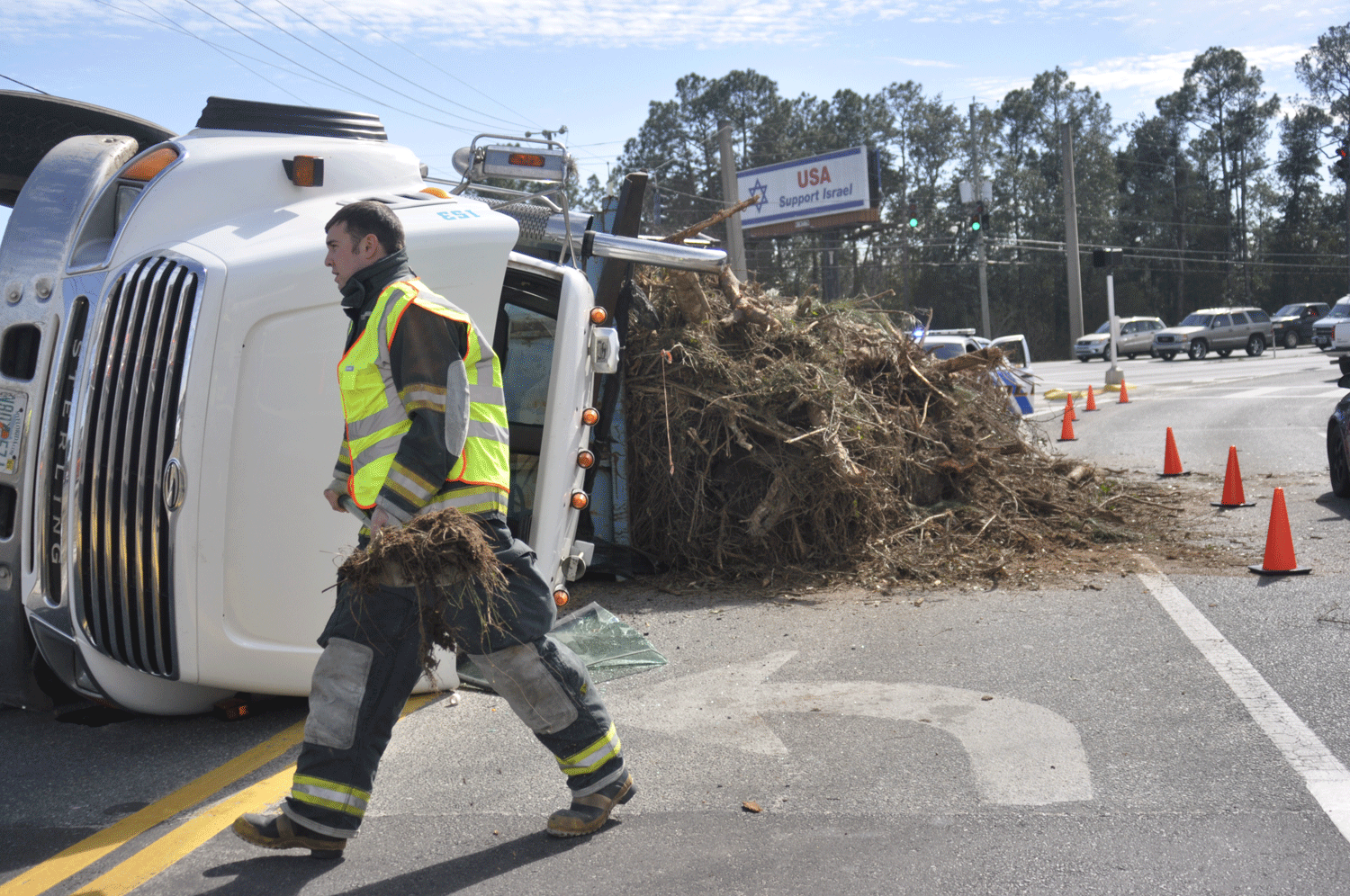 A large tractor trailer hauling dirt and stumps overturned last week at the corner of Glover Lane and Highway 90 in Milton.  The City of Milton responded.  It took three hours to remove the debris and upright the truck, says Milton Fire Chief John Reble.  No one was injured.