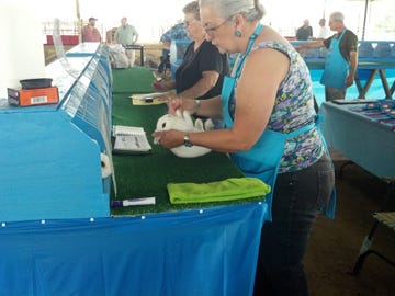 Jeff Albright, a judge licensed since 1994 assigned points from a book of ideal traits of breeds. "Some breeds have more points for the head and others the coat." He explained the best in show doesn't compete against other breeds, just the closest rabbit to 100 points.