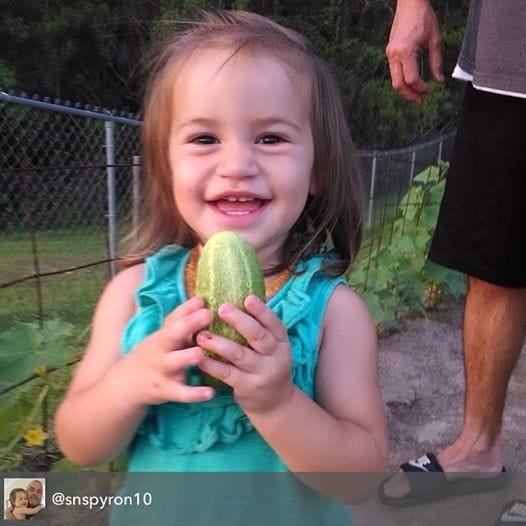 Kenadi Pyron, 19 months old, enjoyed her time on the farm picking cucumbers. She is the daughter of Steve and Stephani Pyron.