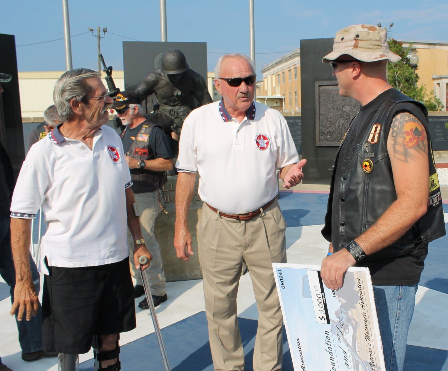 Veterans working together to improve quality of life for those who sacrificed their health for freedom; (left) Veterans Memorial Plaza General Manager Ralph Nesenson, Santa Rosa County Commissioner Don Salter (center) and Bill Pellerin, Combat Veterans Motorcycle Association (CVMA), gave the Vets2VA program $5,000 last August. The Vets2VA program provides transportation to veterans who can’t make their own way to the VA hospital, serviced by Pensacola Bay Transit.