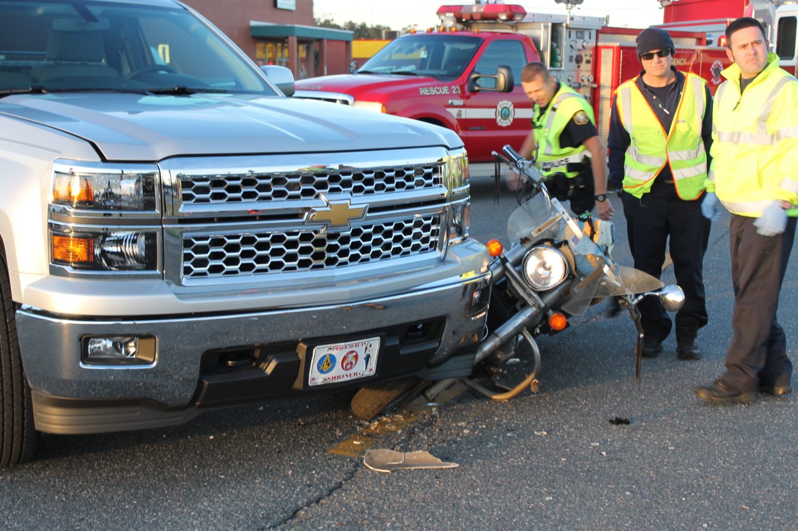 During evening rush hour, Friday, the driver of a Chevy Silverado pulled out from the Six Flags Shopping Center and struck a gray Honda Shadow. The truck hit the motorcycle, putting the bike on its side and pinning the front wheel. The rider suffered a broken arm according to a bystander and coworker, who said he was elated to be alive. Officer Smith with the Milton Police Department (on the left, behind the motorcycle) said it was cut and dry; the driver failed to yield to oncoming traffic. The rider was taken by ambulance to the hospital.