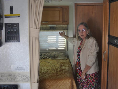 Jeanne Woods, a resident of Jaimee Ridge neighborhood in Milton, shows how the motor home benefits her medical needs in offering air conditioning, a bed and a bathroom. The couple has been at odds with the Jaimees Ridge HOA over where their motor home vehicle is parked.